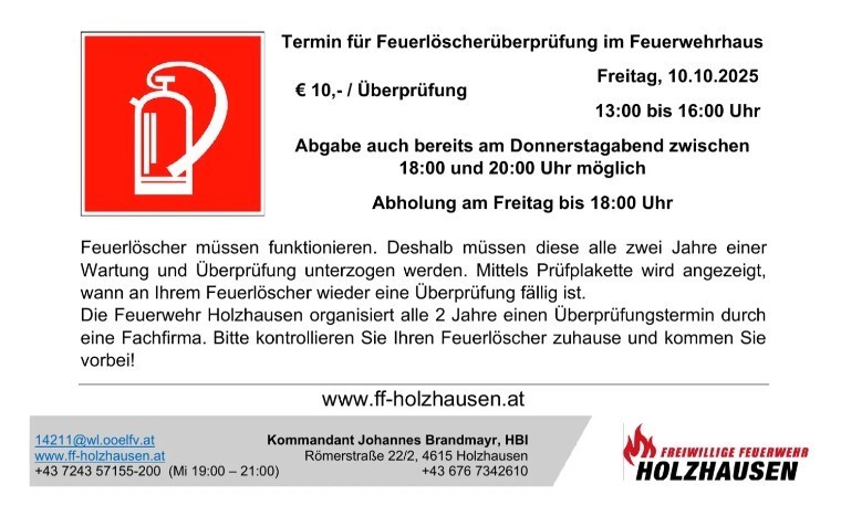 Die Feuerlöscherüberprüfung findet 2025 am Freitag 10. Oktober von 13:00 bis 16:00 statt