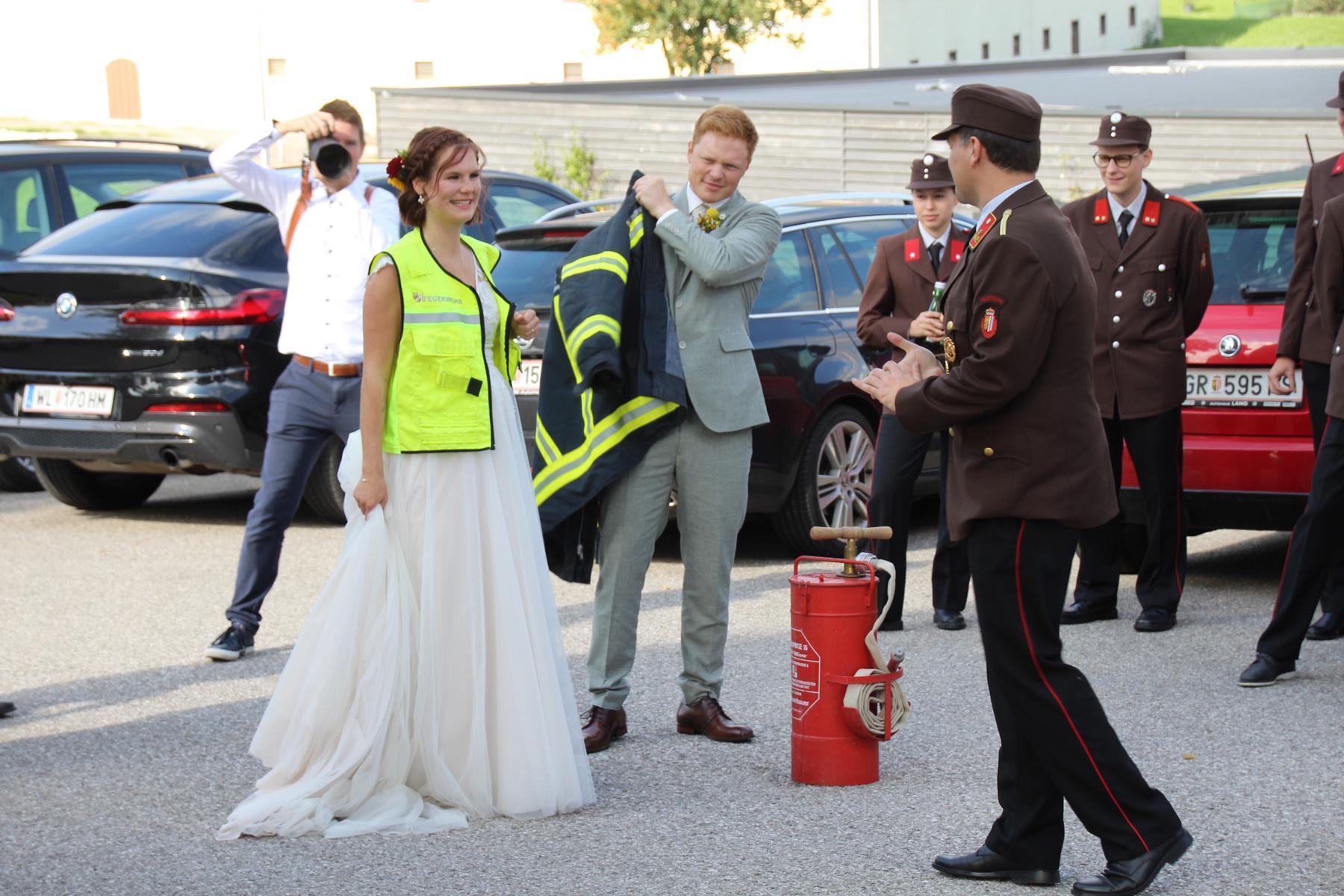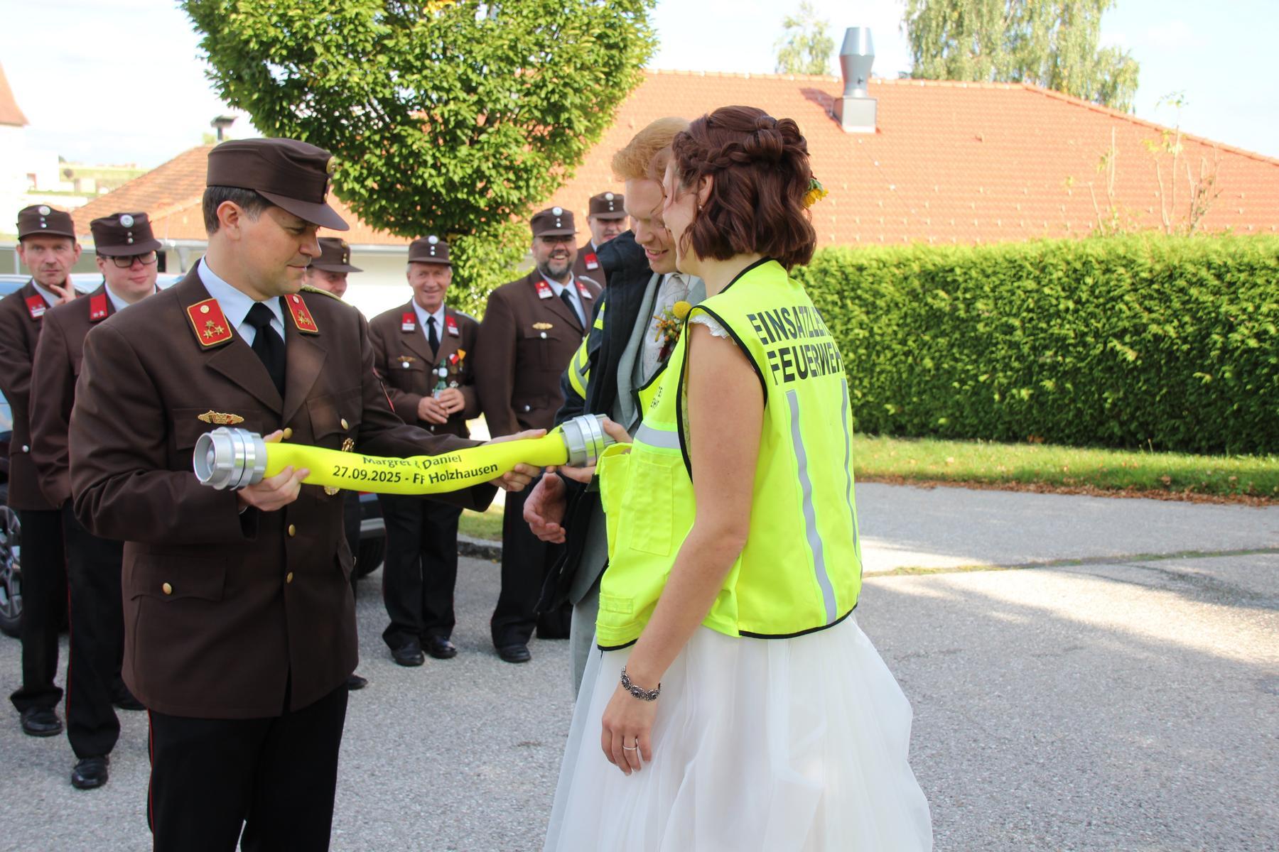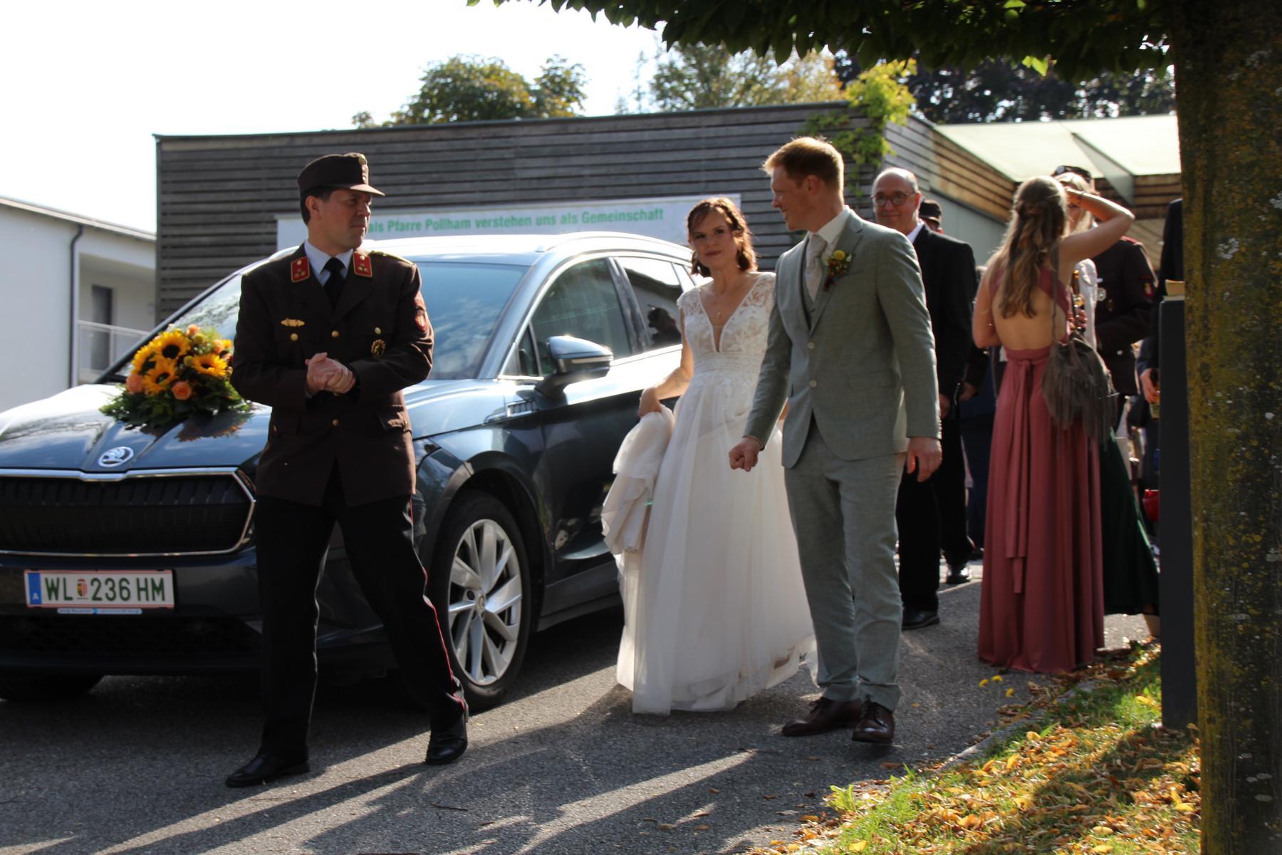 In der Pfarrkirche Pollham fand  dann die kirchliche Trauung statt. Beim Auszug aus der Kirche wurde das Brautpaar mit einem gespannten Schlauchbogen von den Kameraden der Holzhausner Feuerwehr empfangen.