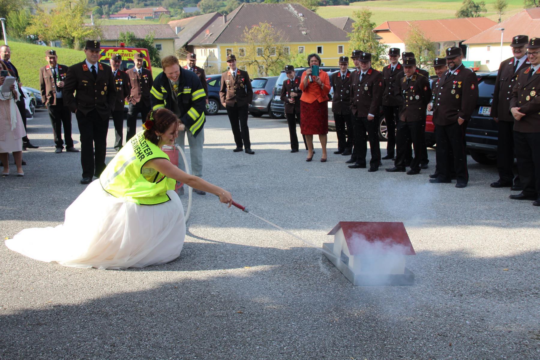 Natürlich musste auch noch eine "Prüfung" als frisch vermähltes Paar absolviert werden. Mittels Kübelspritze musste ein brennendes Haus gelöscht werden.
