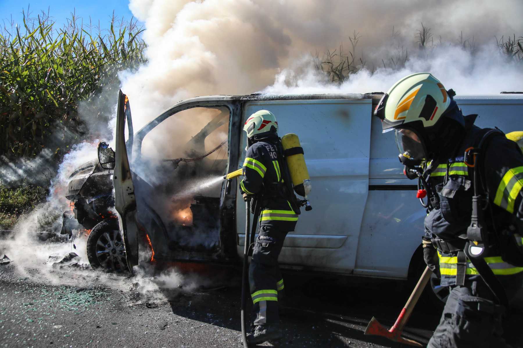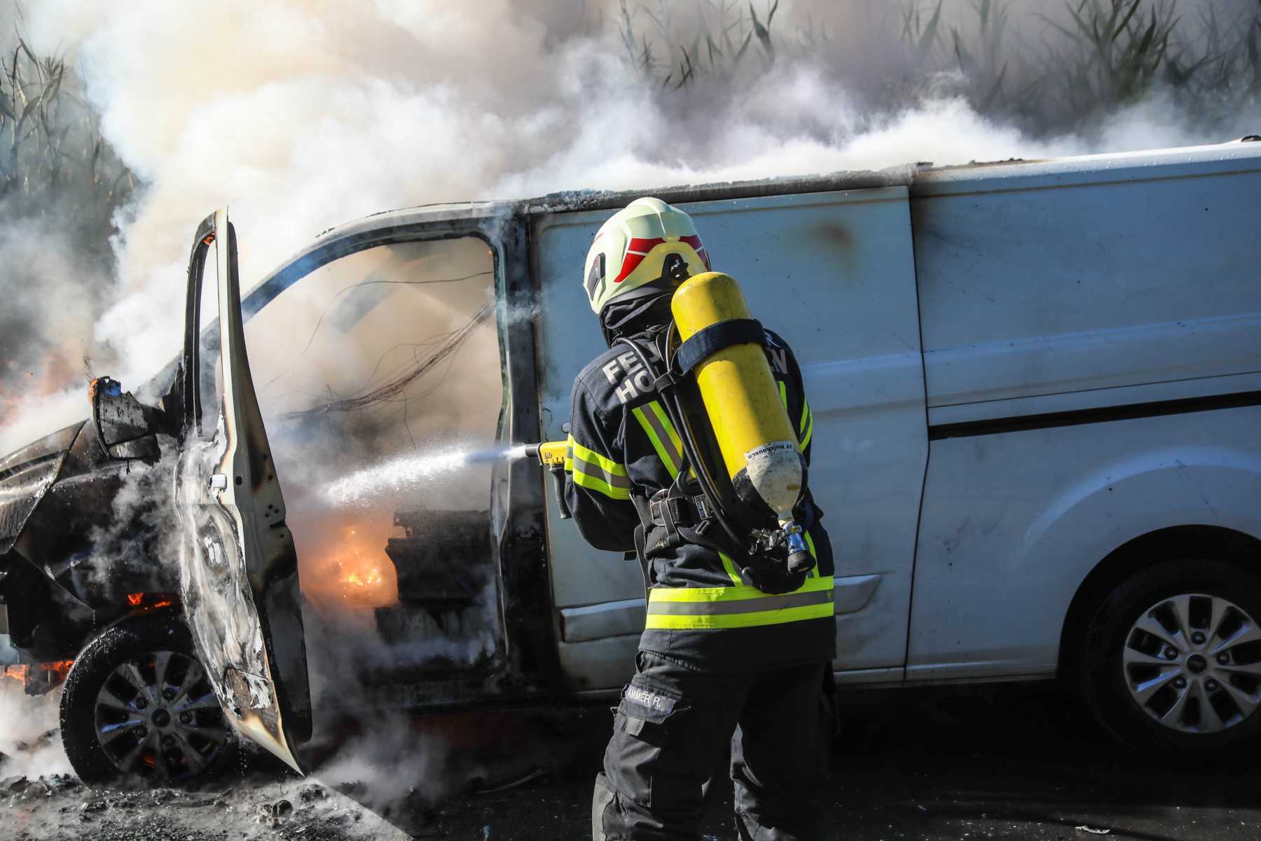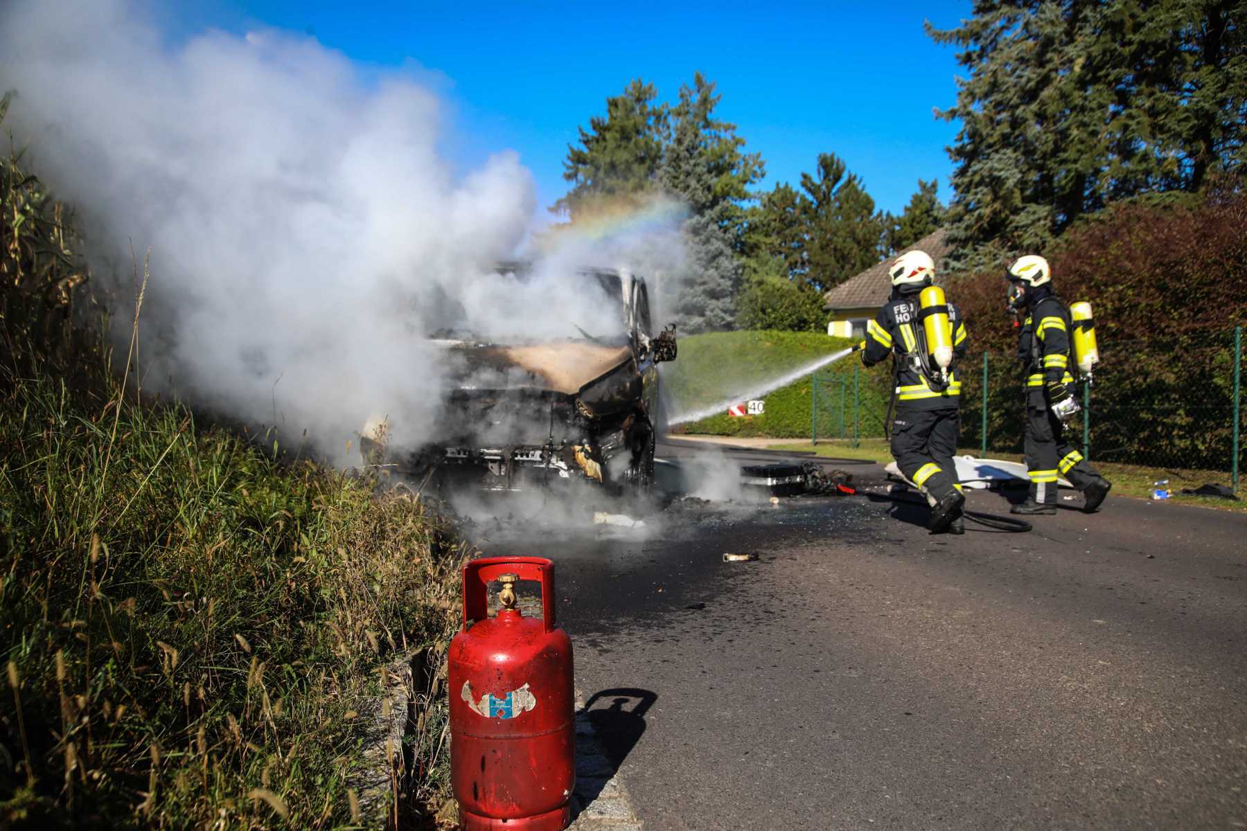 Besondere Gefahr ging von mehreren im Fahrzeug gelagerten Gasflaschen aus welche in weiterer Folge ins Freie gebracht und gekühlt werden.